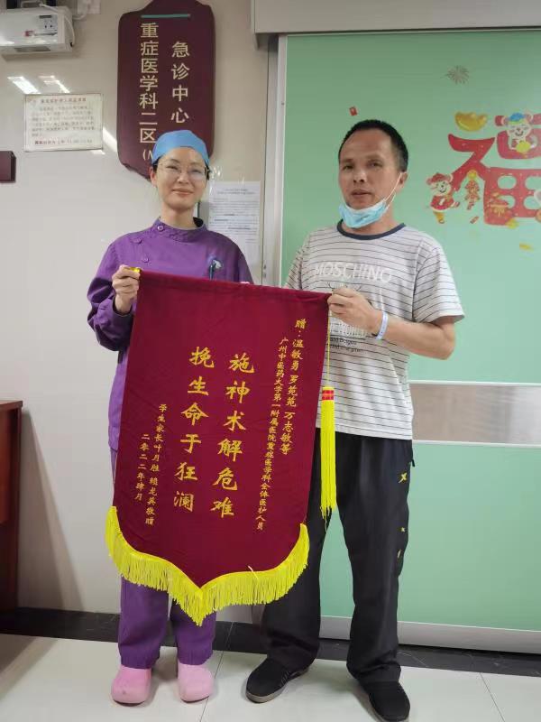 经历了如此凶险经历的学生对老师感激不尽,学生家长也是千恩万谢,将“施神术解危难,挽生命于狂澜”赠予了一附院ICU的医护人员,将“德高尚情如父母,解危难恩同再造”赠予学校老师,由衷感谢ICU全体医护人员及学校老师的无私帮助!