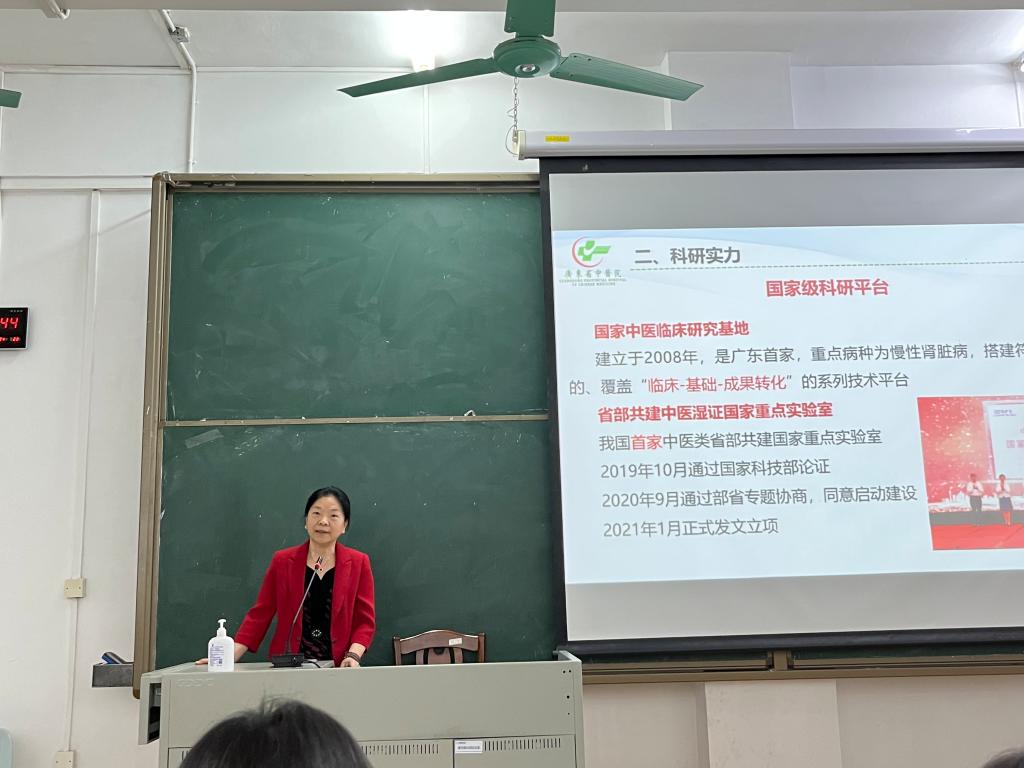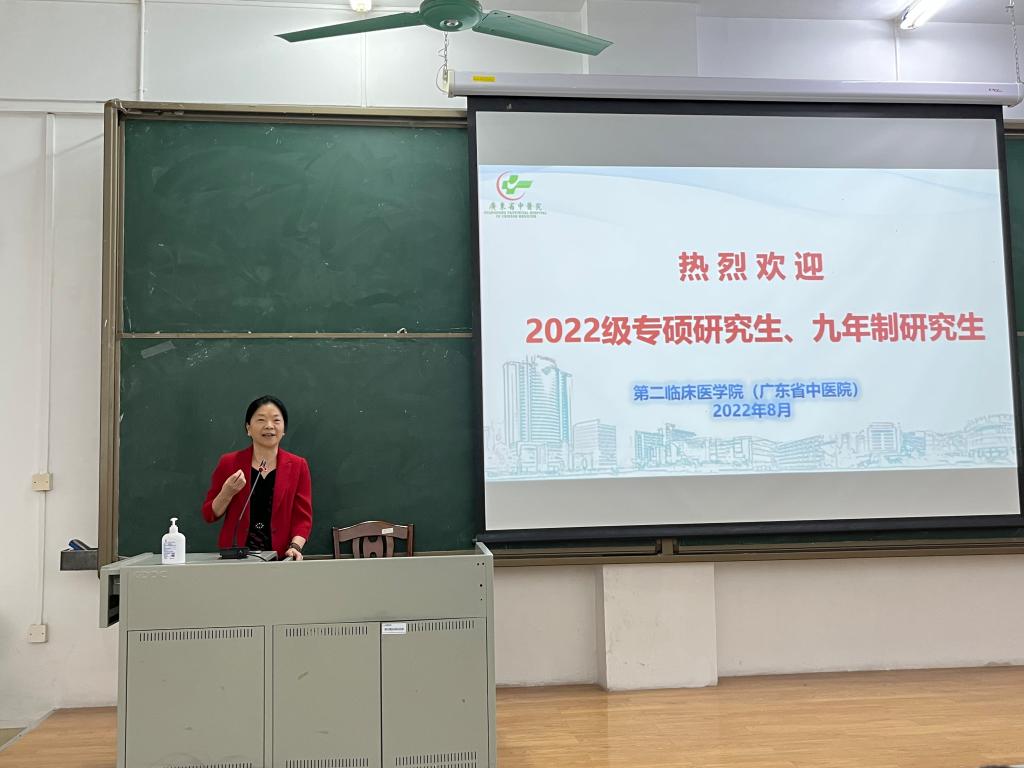 接着,卢传坚副院长进行了研究生教育管理方面的讲座。她首先代表医院欢迎同学们加入Bwin必赢中国官网这个大家庭,然后从医院的发展让同学们了解今后学习的资源和平台,提升同学们的荣誉感和使命感。会上,卢院长称自己为“大师姐”,告诉同学们作为研究生,科研与临床都应两手抓,广东省中医院是集医、教、研三位一体的综合性医院,是极好的平台,大家要把握机会。现代中医不局限于传统医学中的内容,而是中西齐同并进,在肝胆、骨科、急危重症等领域都有一席之地。卢院长强调,医院的平台是为大家开放的,而如何合理利用资源,是否能找到资源,是大家需要努力的。基于此,同学们应当重视自己的轮科生活,在临床上明确自己的学习任务,在科研上向上求索,在学业上找到自己的节奏,增长能力,获得中医自信。
