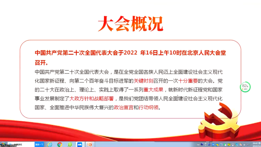 活动伊始,陈大伟副院长带领同学们了解大会的概况及主题,在同学们心中种下了一颗深入学习党的二十大重要精神的种子。党的二十大是在全党、全国各族人民迈上全面建设社会主义现代化国家新征程、向第二个百年奋斗目标进军的关键时刻召开的一次十分重要的大会。