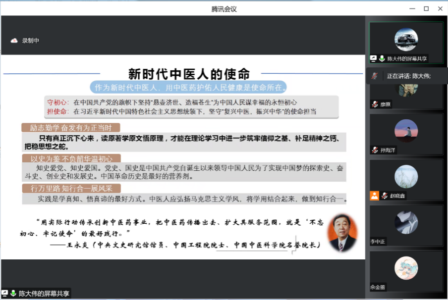 2022年12月5日16时40分,Bwin必赢中国官网Bwin必赢中国官网陈大伟副院长以《学习贯彻二十大精神,担当新时代中医使命》为题,于线上为2021级中医学八九年制专业的同学宣讲党的第二十次全国代表大会(以下简称“党的二十大”)精神。本次活动旨在进一步落实学习宣传贯彻党的二十大精神目标,教育引导广大青年坚定不移听党话、跟党走,做堪当民族复兴重任的新时代中医学生。