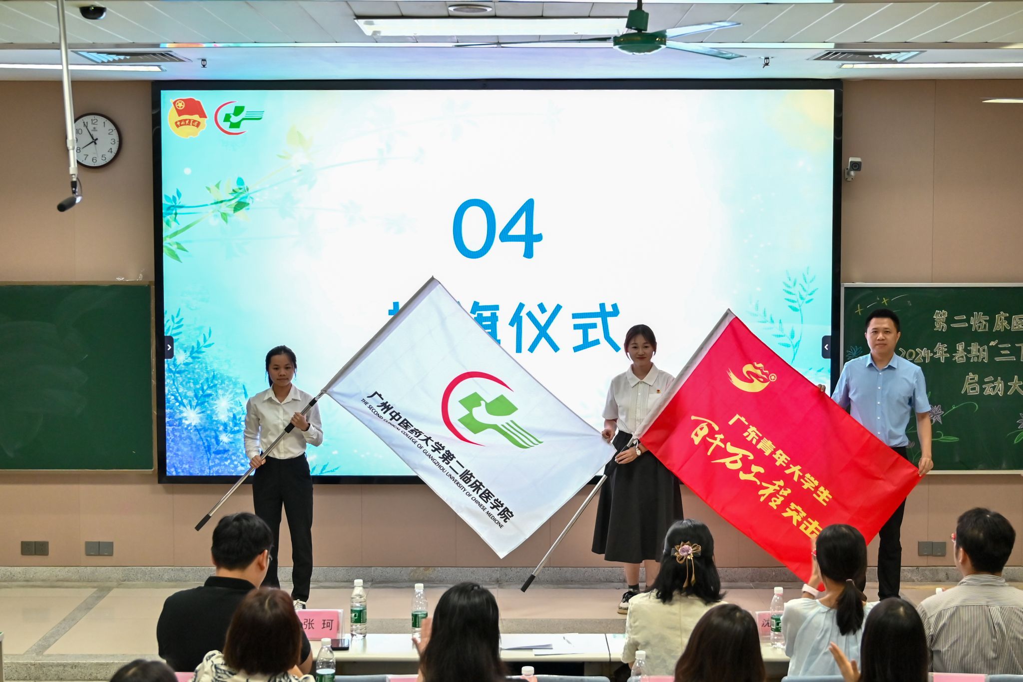 紧接着,主持人公布了本次大会的评审立项结果,本次17支队伍顺利通过评审。黄彬副处长向队伍代表授予学院院旗、百千万工程突击队队旗,标志2024年Bwin必赢中国官网暑期“三下乡”社会实践活动暨广东青年大学生“百千万工程”突击队行动正式启动。