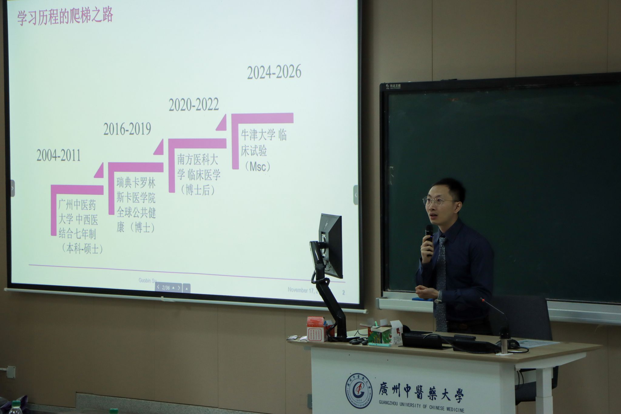 苏国彬以《平衡临床与科研——浅谈规划学习及中医临床》为题,结合自身成长经历,和同学们分享生涯规划的意义和科研思维形成的方式方法。他鼓励同学们在理论学习和临床实践中寻找科研灵感,用科学研究去解决临床问题,让科研成为提升医疗服务质量的有力工具;同时,他现身说法,举出自己获得世界顶尖学府博士学位后仍攻读科研领域硕士学位的例子,鼓励同学们要持续学习、不断提升自己。