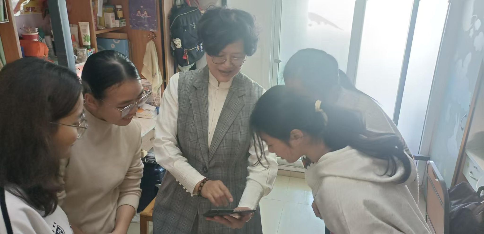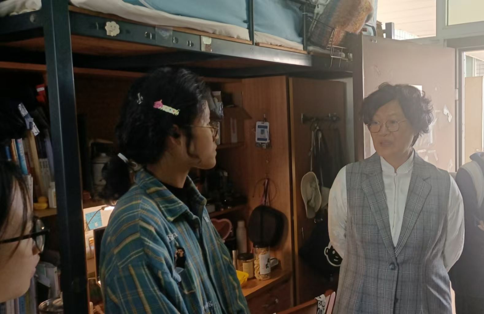 杨院长也非常关心学生的在校生活,在辅导员柳丹老师和学生干部的陪同下到女生宿舍走访。期间,杨院长关心和询问了同学们的课程学习、宿舍环境和日常生活等方面的情况。尤其提到要同学们重视运动。杨院长指出,学习和运动应该并重。她强烈建议同学们养成每日运动的习惯,并向同学们展示自己大学时运动的照片,鼓励同学们多进行如跑步、跳绳等有氧运动,塑造健康的体魄,为长期的学习和生活奠定坚实的基础。