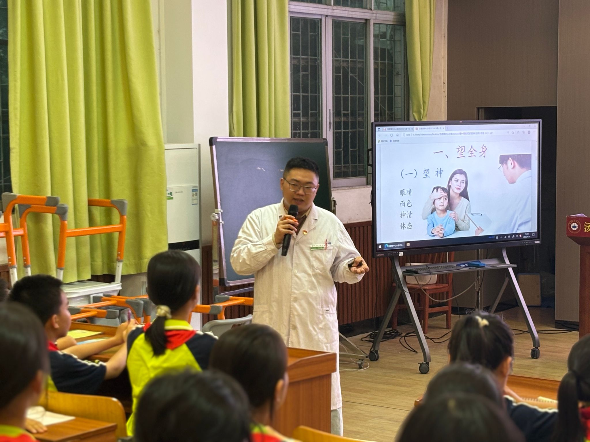 随后,一场别开生面的中医药科普讲座——《如何发现身体上的小信号》在孩子们的期待中拉开帷幕。研究生张开源运用生动形象的比喻和通俗易懂的语言,将中医“望闻问切”的诊疗方法转化为孩子们易于理解的生活常识。他引导孩子们通过观察面色、舌苔等细微变化来关注自身健康,让他们在轻松愉快的氛围中学习到中医药文化的精华。讲座现场,孩子们踊跃互动,争相分享自己的观察发现,展现出对中医药文化的浓厚兴趣和热爱。