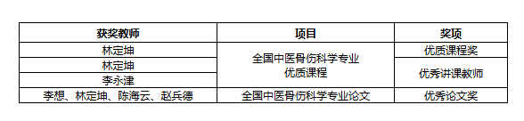 同时,在第二届全国中医骨伤科学专业优质课程研讨评比中,《中医伤科学》课程获评“优质课程”;林定坤、李永津两位教师获评“优秀讲课教师”称号;李想、林定坤、陈海云、赵兵德撰写的教学论文获评“优秀论文奖”。