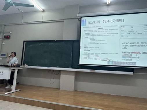医院感染管理办公室何志鹏老师强调了医院感染预防与控制的重要性。他重点讲解了手卫生、标准预防、职业防护等核心内容,向同学们展示了院感隐患带来的危害,要求大家时刻保持警惕,将感控措施严格落实到每一个诊疗细节中,守护患者与自身安全。